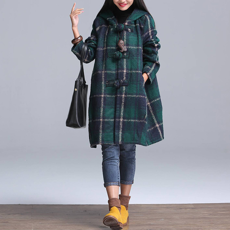 2015新品冬裝文藝大盤扣連帽外套 大碼女裝格子羊毛呢外套 /