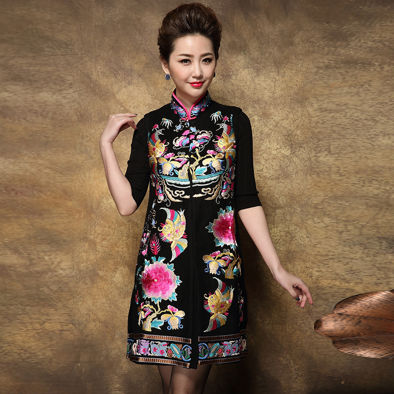 2015秋冬女裝中國民族風(fēng)重工刺繡花針織貂絨旗袍領(lǐng)中長款女連衣裙 /
