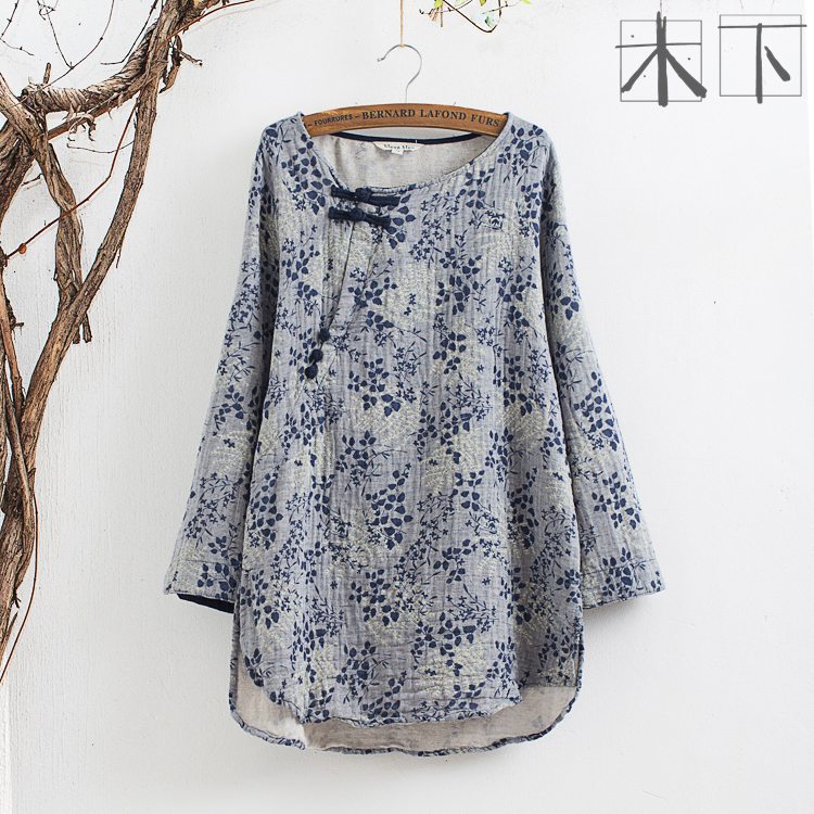 中式復古盤扣上衣 寬松長袖撞色青花襯衣 顯瘦女文藝范短棉麻上衣 /