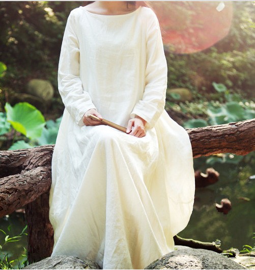 原創(chuàng)文藝亞麻連衣裙長袖一字領(lǐng)長裙楊麗萍同款連衣裙 /