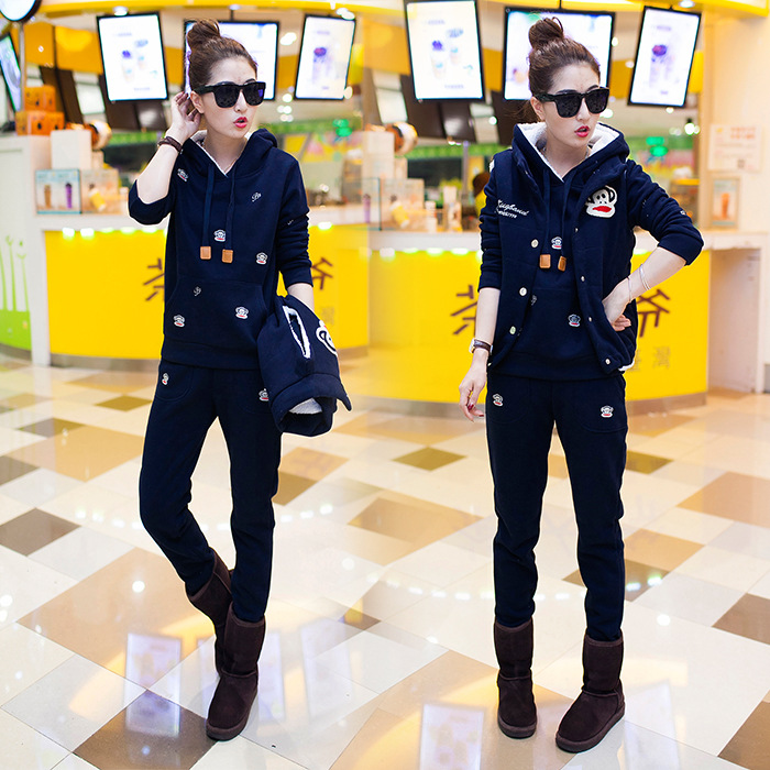 女裝加絨加厚學生連帽套頭衛衣三件套大嘴猴運動休閑套裝 /