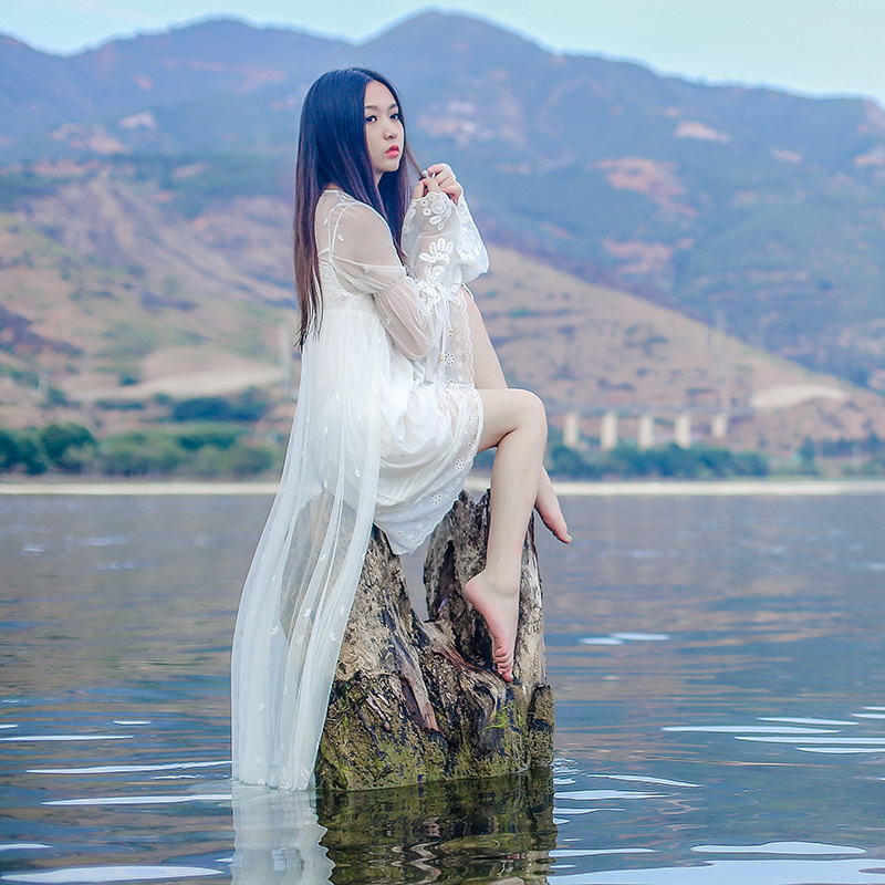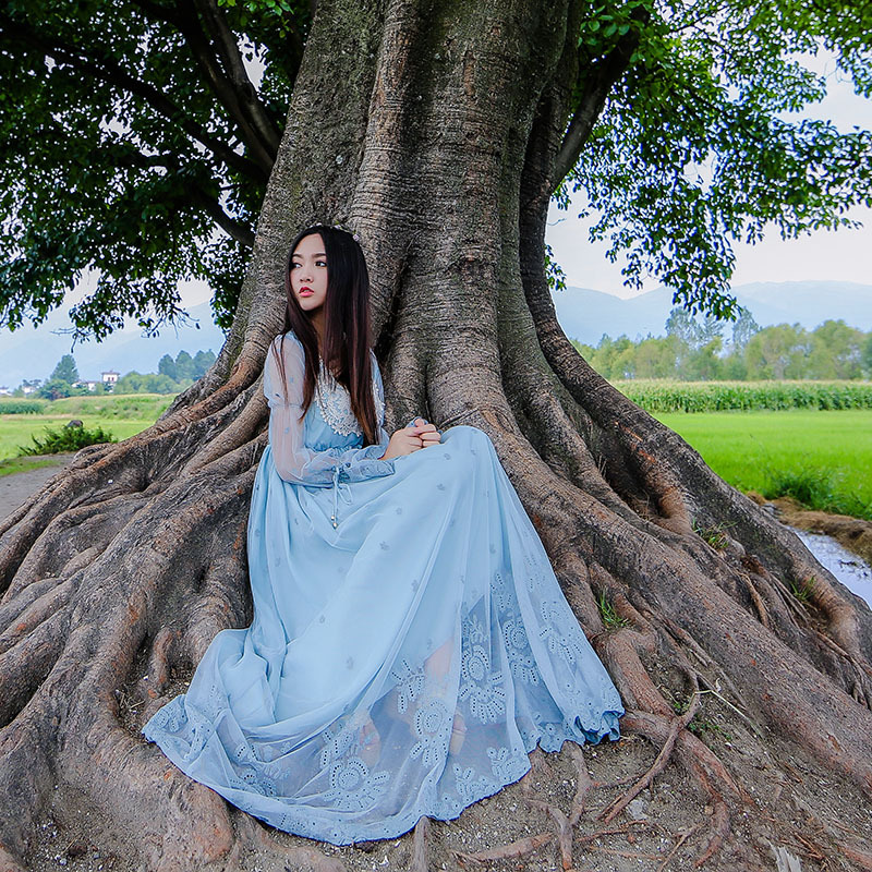 實拍原創設計復古文藝范蕾絲刺繡長袖連衣裙度假玉簪花禮服長裙 /