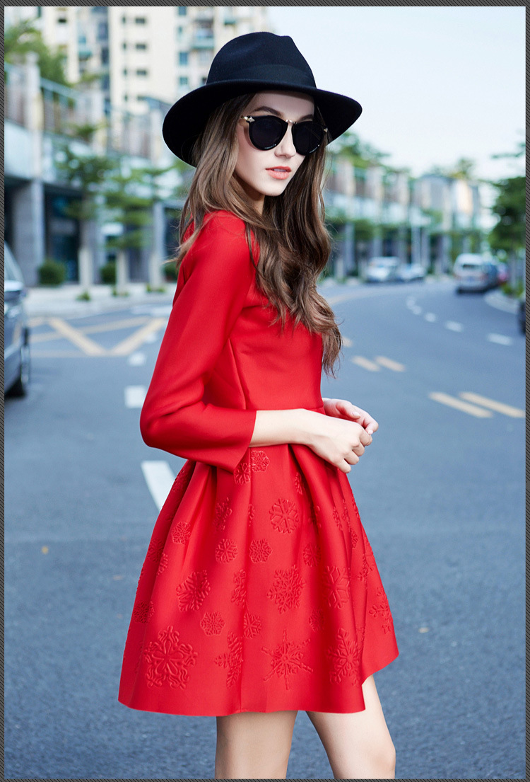 2015秋新款太空棉長袖連衣裙打底裙修身收腰紅色百褶a字裙公主裙 /
