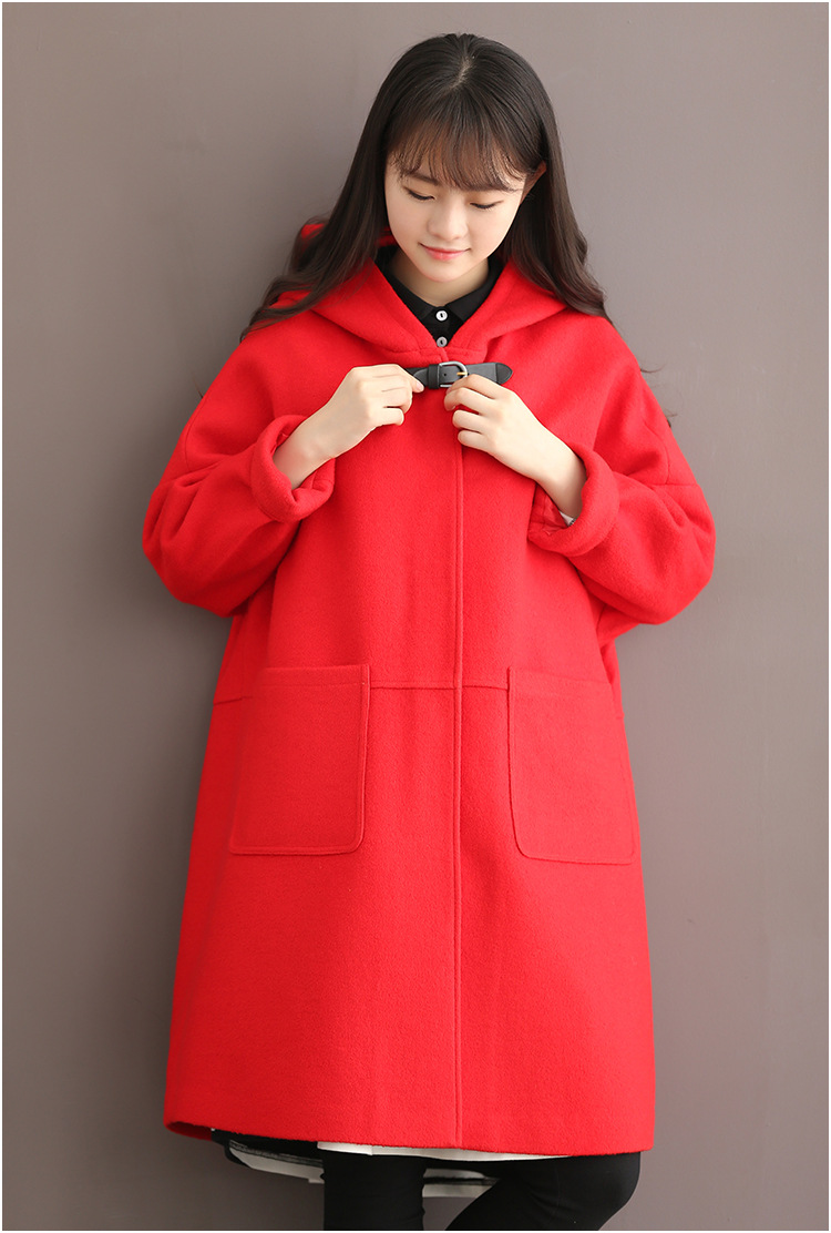 秋冬文藝復古連帽寬松大碼清新中長款純色毛呢子羊毛多色大衣外套 /