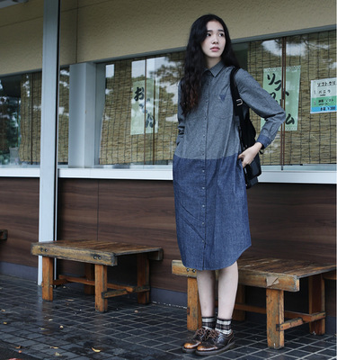 鹿與飛鳥小清新牛仔撞色拼接寬松棉麻襯衫中長款連衣裙襯衫裙 /