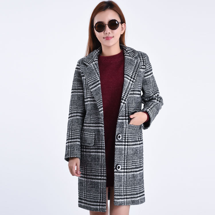 簡介: 貨號JK550 產地廣州 品牌其他 主圖來源實拍有模特 產品類別大衣 貨源類別現貨 是否庫存是 庫存類型整單 面料名稱毛呢 主面料成分羊毛 主面料成分的含量50(%) 圖案格紋 風格韓版 厚薄加厚 版型修身型 衣長中長款(65cm<衣長≤80cm) 領型翻領 袖長長袖 衣門襟單排扣 是否有腰帶無腰帶