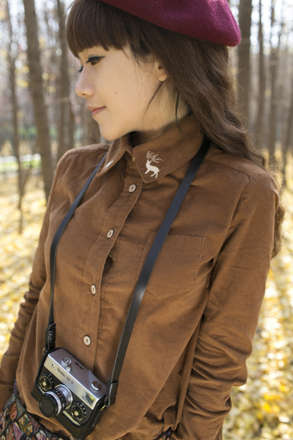 1382#2014秋冬新款女 燈芯絨小鹿刺繡修身長袖襯衫 /