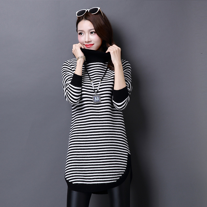 2015年秋冬新款寬松條紋羊毛保暖打底衫針織高領套頭毛衣中長款厚 /