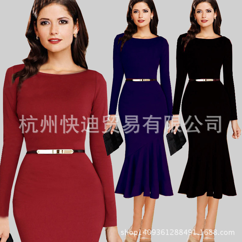 2015新款歐洲站 歐美 外貿女裝批發 時尚長袖魚尾修身連衣裙 /