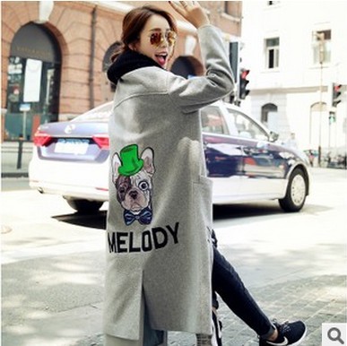 秋冬新款女裝毛呢大衣女韓版中長款小狗圖案字母刺繡毛呢外套潮 /