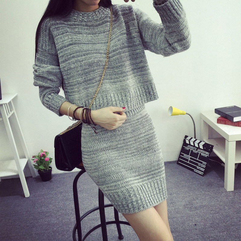 韓國代購秋冬季女新款拼接針織毛衣包臀裙子連衣裙兩件套套裝 /
