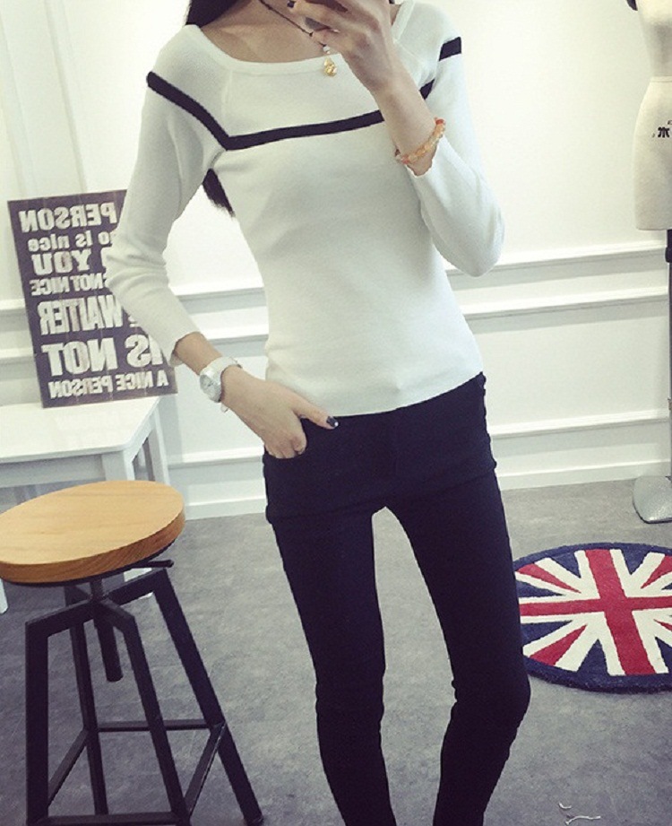 2015秋冬新款女裝修身針織條紋套頭一字領長袖針織百搭打底衫 /