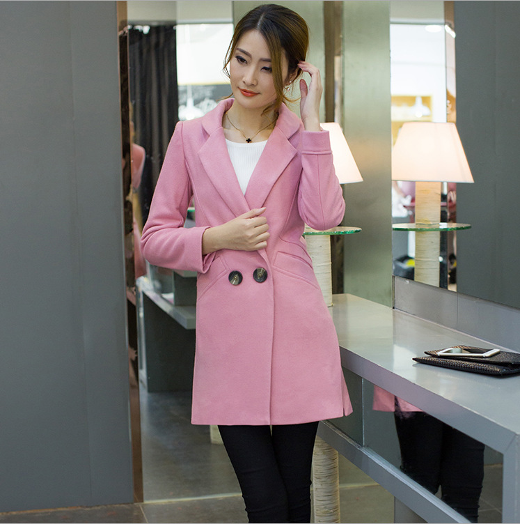 歐洲站2015秋冬新品韓版修身中長款長袖西裝領時尚毛呢大衣外套女 /