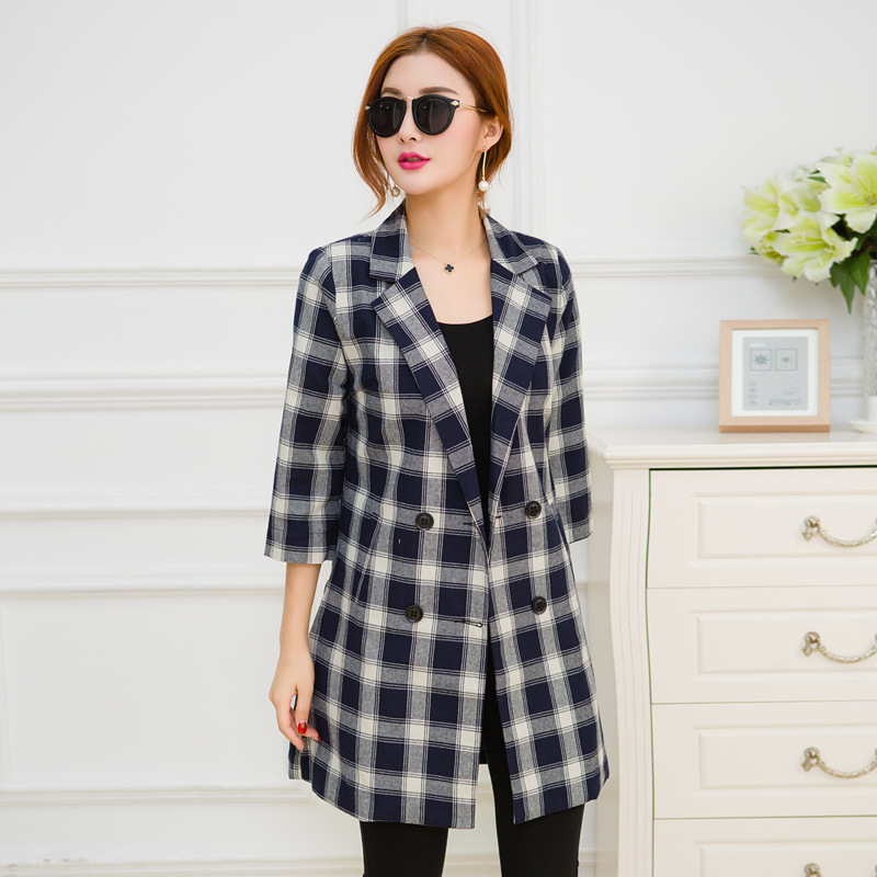 2015秋季新款韓版氣質寬松顯瘦翻領格子七分袖雙排扣中長款外套女 /