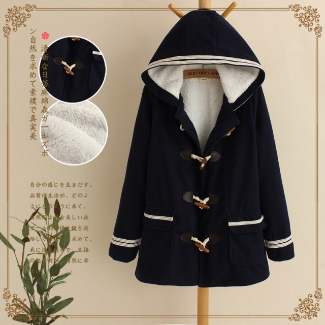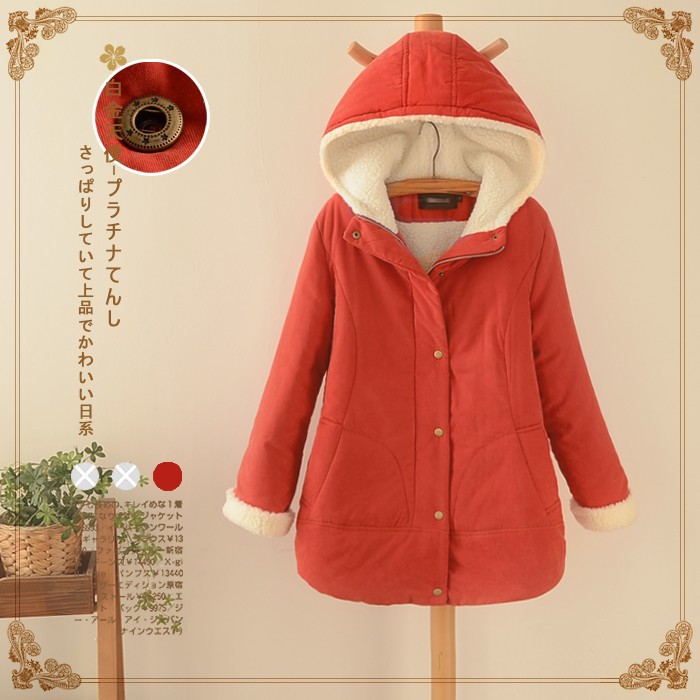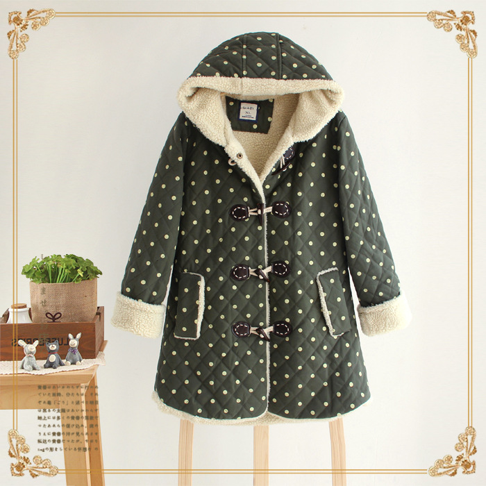 雷氏布衣圓點連帽中長款羊羔絨加厚棉衣女棉服外套日系森女系2015 /