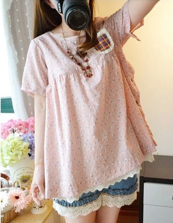 正品2015春夏款貼布甜美森女棉麻圓領高腰寬松碎花短袖娃娃衫上衣 /
