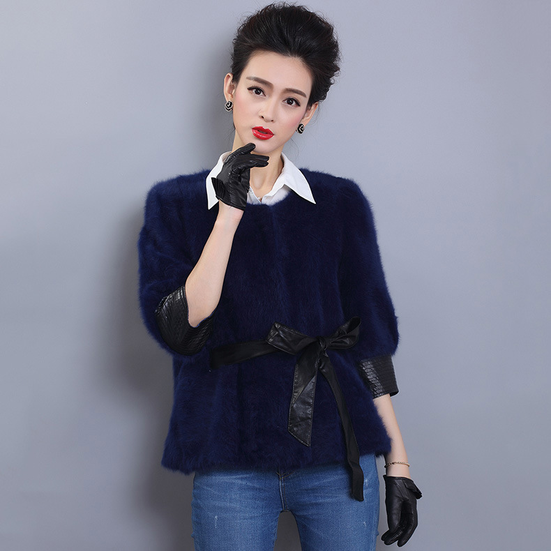 2015秋冬歐美新款女款貂絨大衣純色中袖袋圓領(lǐng)外套帶腰帶 /