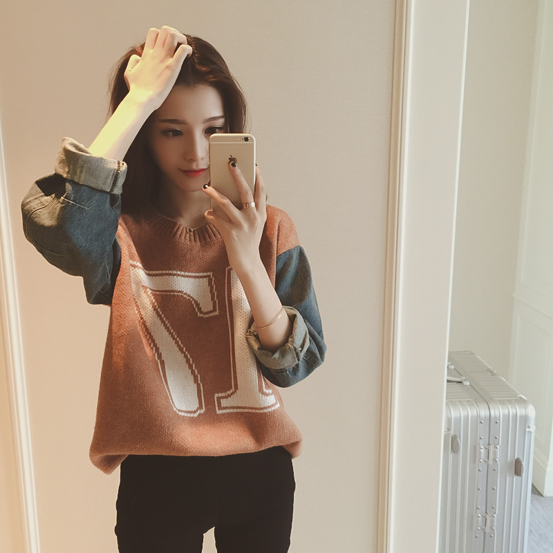 2015秋裝韓國新款牛仔拼接假兩件套頭針織衫上衣女 /