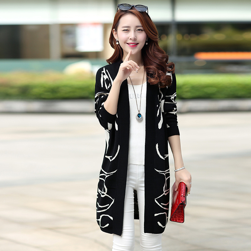 5829 2015秋冬新款韓版撞色長(zhǎng)袖毛衣外套長(zhǎng)款開衫女式針織衫批發(fā) /