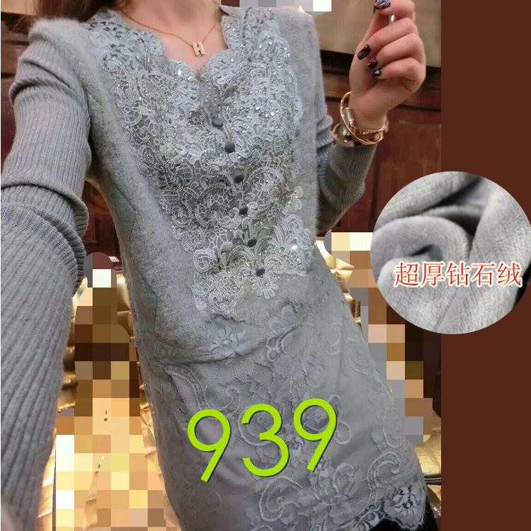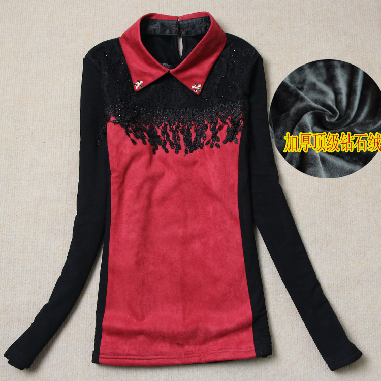 批發冬裝大碼加絨加厚蕾絲打底衫女上衣長款韓版修身長袖蕾絲衫 /