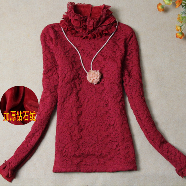 2015秋冬 女 蕾絲加絨加厚長袖打底衫 高領新款蕾絲衫 上衣 /