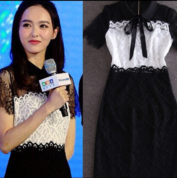 2015夏款唐嫣同款蝴蝶結睫毛蕾絲短袖連衣裙女黑白蕾絲拼色 /