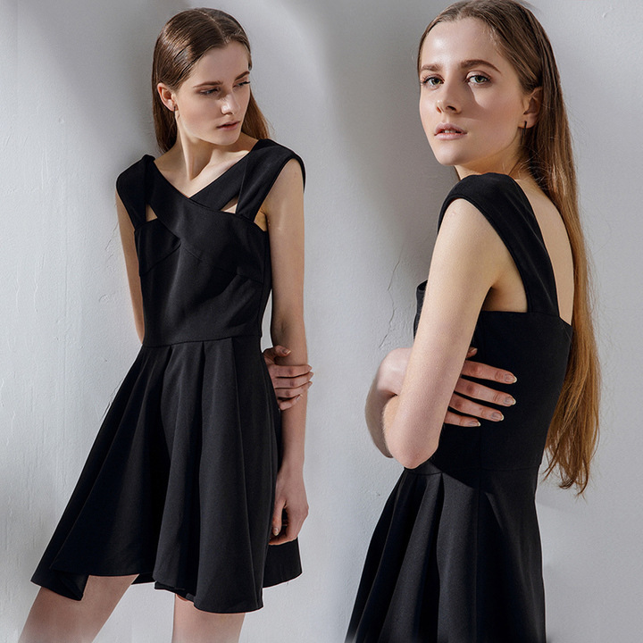 2015大牌同款名媛禮服中長款夏裙露背吊帶交叉小黑裙赫本連衣裙女 /