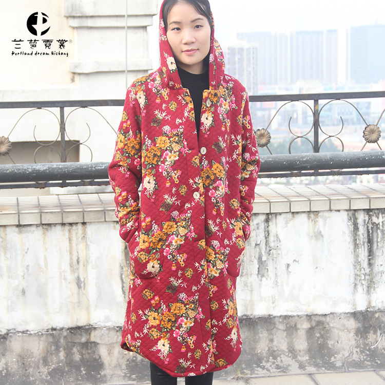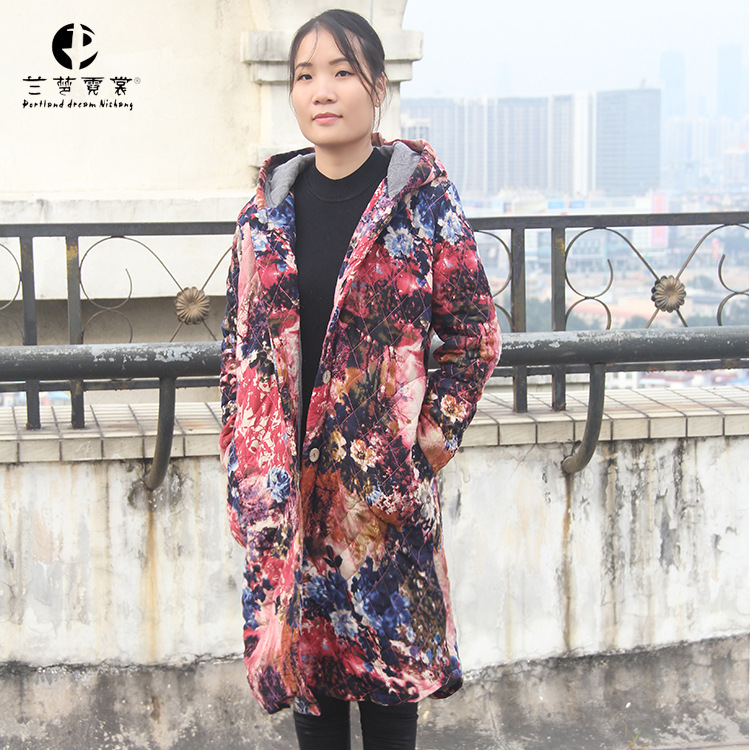 2015韓版文藝復古印花加厚中長款保暖連帽羊羔毛棉麻棉襖廠家批發 /