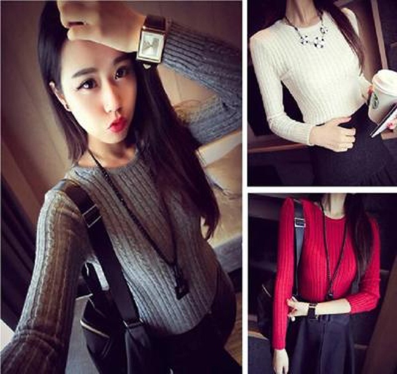 2015秋裝韓版新款時尚純色百搭圓領修身螺紋針織衫批發廠家直銷 /