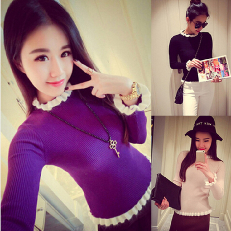 2015 秋冬新款韓范甜美木耳花邊氣質顯瘦打底針織衫女式批發 /