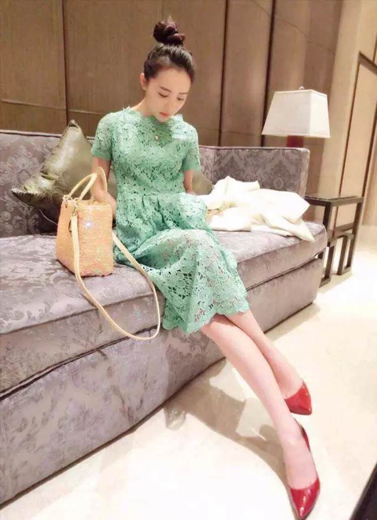 2015夏新款女裝韓名媛高端水溶薄荷綠蕾絲鏤空長款高檔氣質連衣裙 /