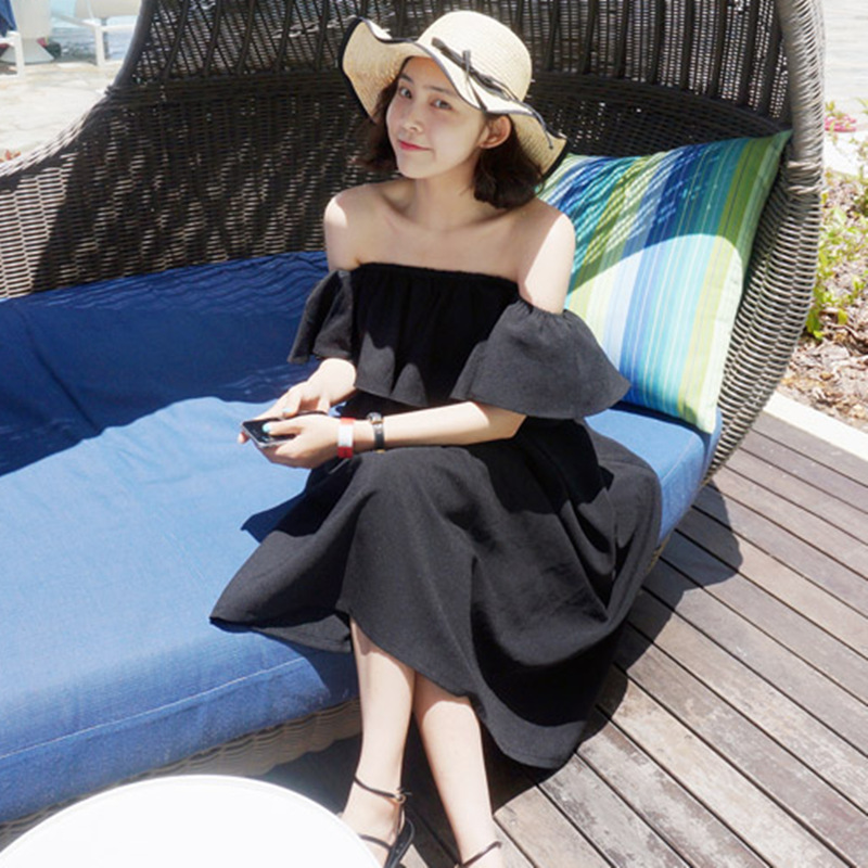 2015韓版女裝 荷葉邊性感一字露肩兩穿沙灘度假時尚休閑連衣裙 /
