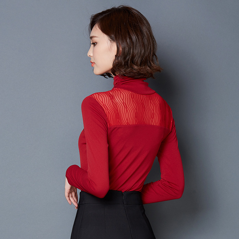 (實拍)2015秋冬新款韓版加絨大碼修身蕾絲網紗打底衫潮 /