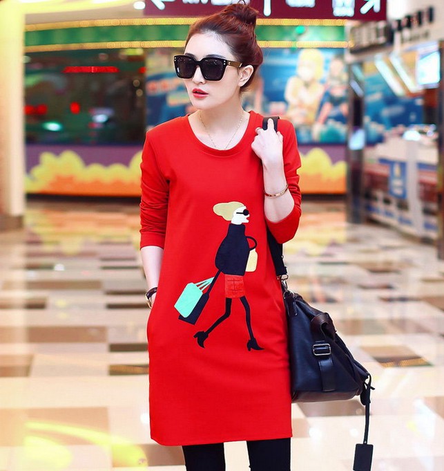 實拍8305#2016春新款韓版美女圖案中長款大碼女裝寬松打底連衣裙 /