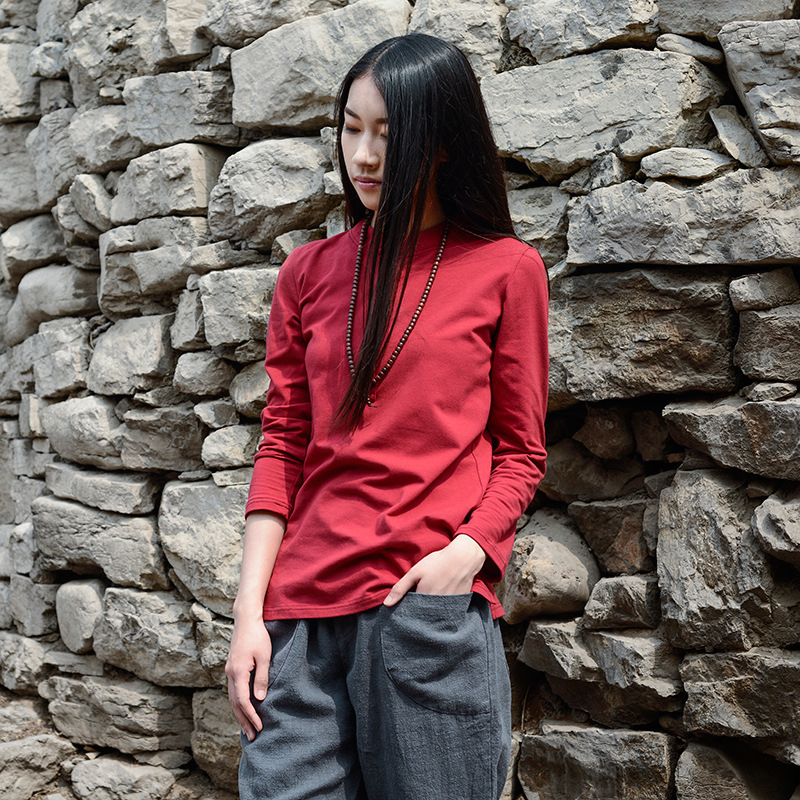 春秋新款文藝復古簡約百搭半開襟純色襯衫女長袖T恤 /