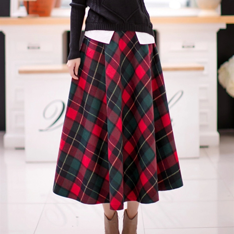 英倫風新款秋冬女文藝復古羊毛呢格子長裙大擺A字裙 1件起批 /