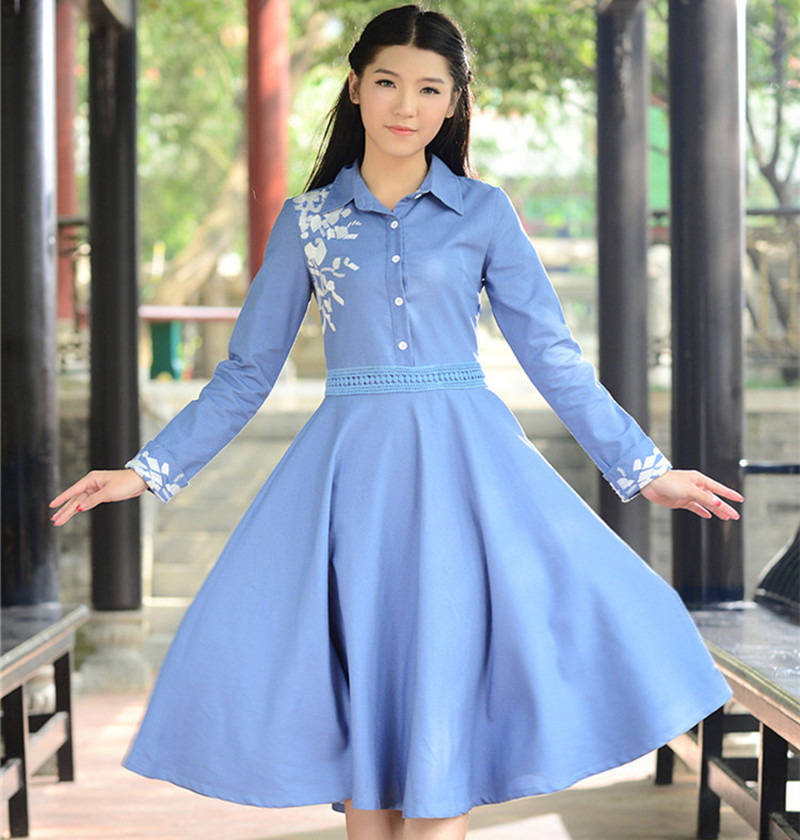秋冬新品甜美女裝繡花棉麻修身大擺長裙襯衣領收腰連衣裙 1件起批 /