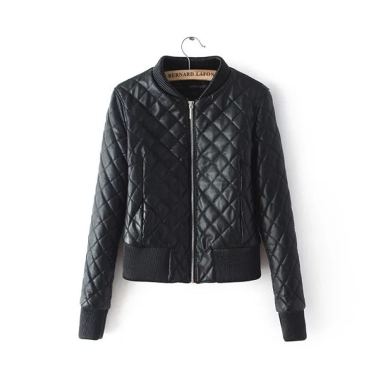 歐洲站2015冬季女裝新款外套 立領純色菱形褶裥加厚修身PU皮衣 女 /