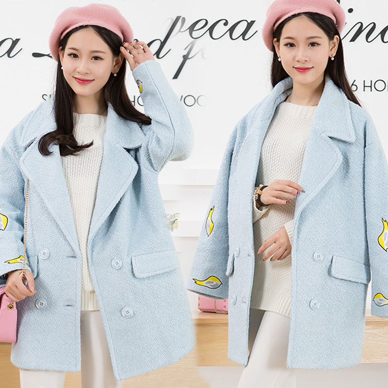 韓版秋冬新款中長款毛呢子大衣女雙排扣繡花毛呢外套 /