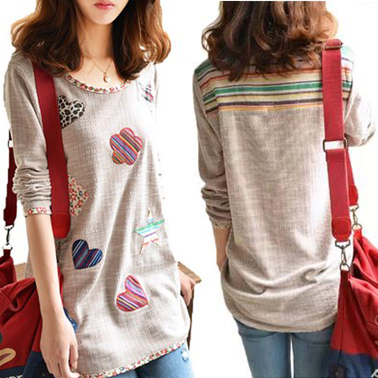 2015秋裝新款大碼胖mm 小清新碎花貼布包邊打底衫中長款T恤# /