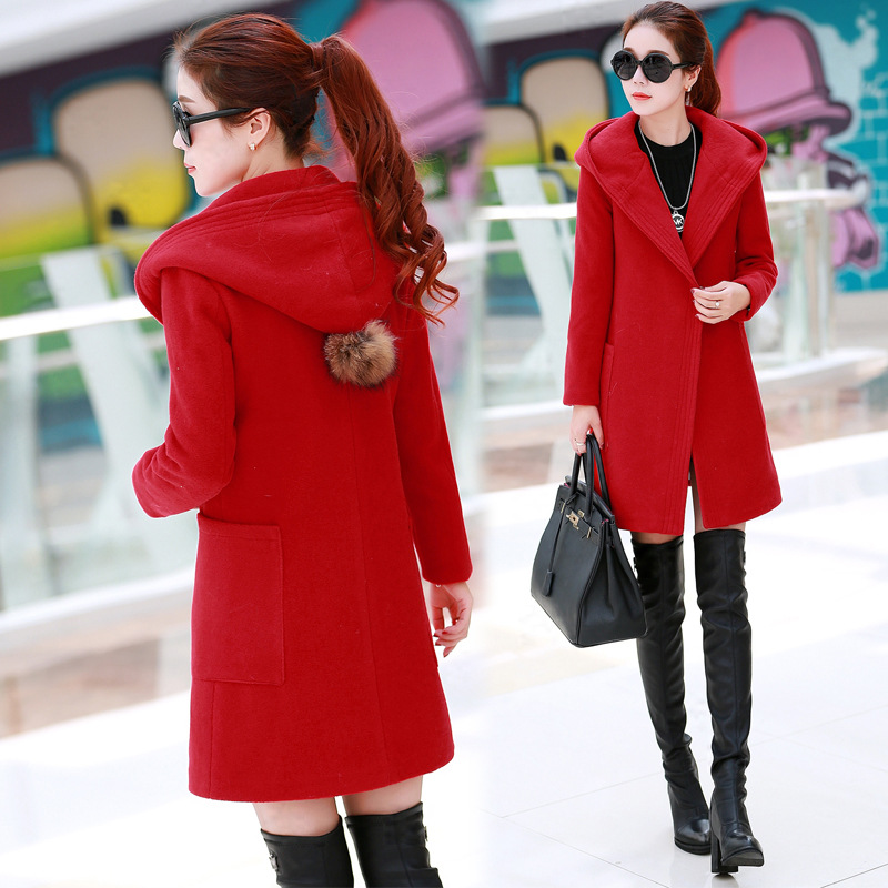 2015秋冬裝新款毛呢外套女裝韓國中長款連帽加厚羊毛呢子大衣大碼 /