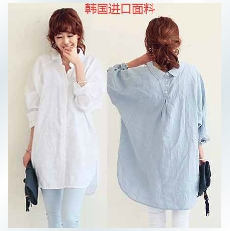 韓國進口亞麻純棉女飄逸寬松長款大碼襯衣長袖白襯衫女休閑襯衫 /