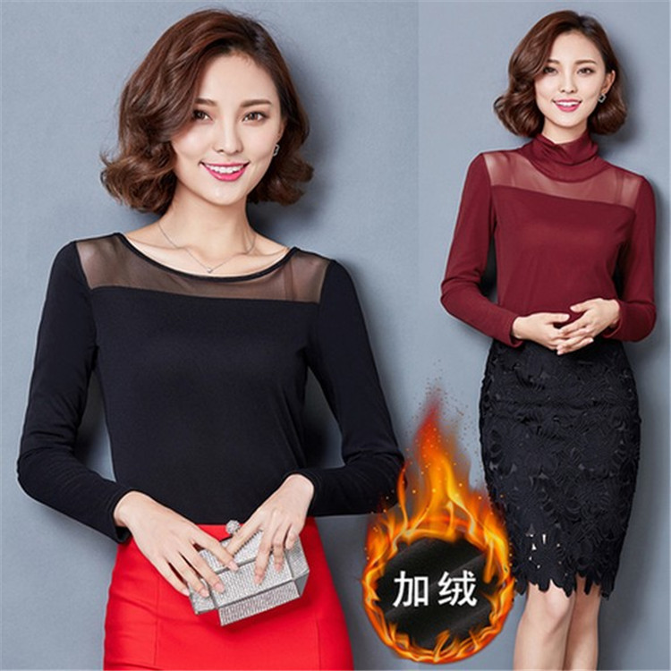 2015冬季新款女裝牛奶絲加絨加厚圓領網紗蕾絲打底衫大碼上衣女 /