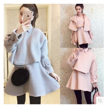 2015冬裝新款呢料娃娃袖外套搭可愛(ài)背心A字名媛連衣裙兩件套# /