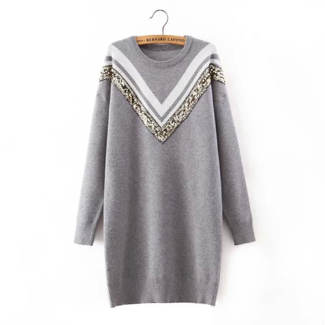8812-韓版潮2015冬季女裝新款 圓領寬松V形拼色加厚亮片長款毛衣 /