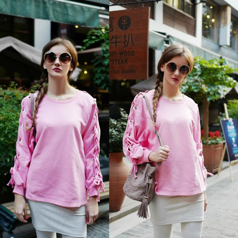 2910-韓版潮15秋冬女裝新款上衣 純色圓領側邊系帶寬松插肩袖衛衣 /