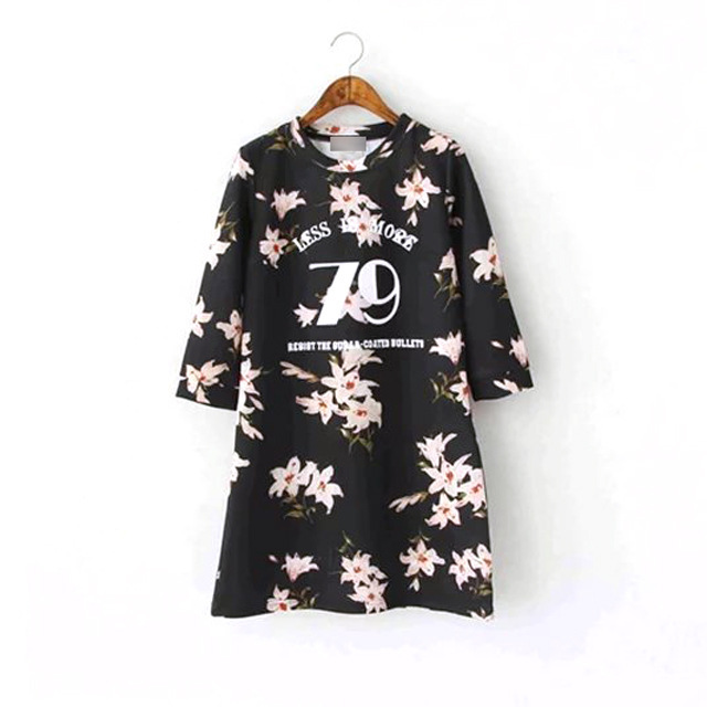 5949-歐美風2016春季女裝新款 圓領七分袖花朵字母數字印花連衣裙 /