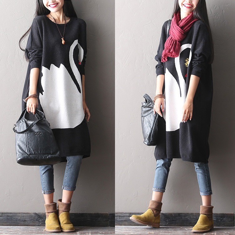 【安 琪】冬裝新款天鵝印花套頭衫 加厚女士毛衣大碼蝙蝠袖羊毛衫 /