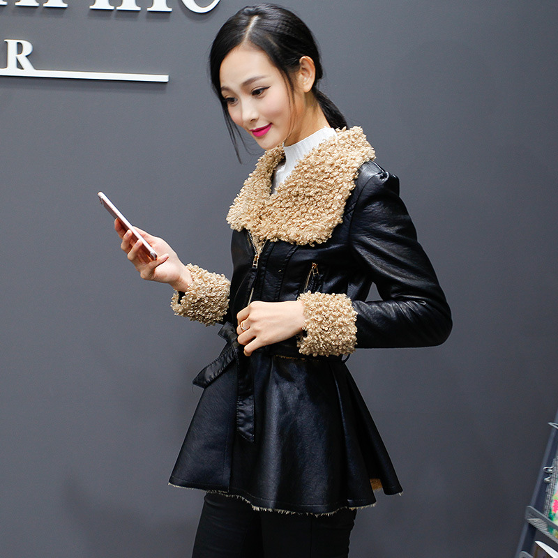 2015冬裝新款韓版中長款修身顯瘦毛領加絨加厚長袖pu皮衣外套女裝 /