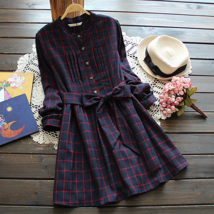7600新款2015春季氣質學院風女裝格子收腰系帶長袖立領套頭連衣裙 /